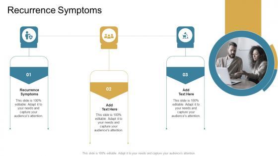 Presenting our innovatively designed set of slides titled Recurrence Symptoms In Powerpoint And Google Slides Cpb This completely editable PowerPoint graphic exhibits Recurrence Symptoms that will help you convey the message impactfully. It can be accessed with Google Slides and is available in both standard screen and widescreen aspect ratios. Apart from this, you can download this well structured PowerPoint template design in different formats like PDF, JPG, and PNG. So, click the download button now to gain full access to this PPT design. Our Recurrence Symptoms In Powerpoint And Google Slides Cpb are topically designed to provide an attractive backdrop to any subject. Use them to look like a presentation pro.