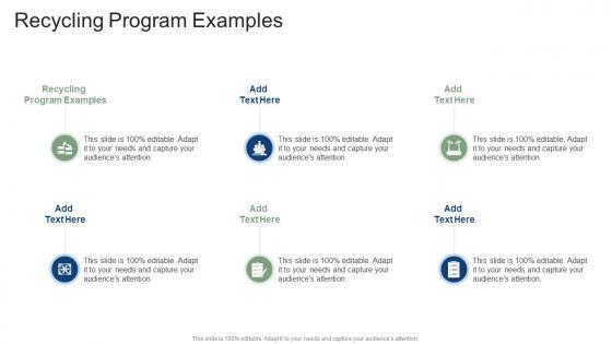 Introducing our well designed Recycling Program Examples In Powerpoint And Google Slides Cpb. This PowerPoint design presents information on topics like Recycling Program Examples. As it is predesigned it helps boost your confidence level. It also makes you a better presenter because of its high quality content and graphics. This PPT layout can be downloaded and used in different formats like PDF, PNG, and JPG. Not only this, it is available in both Standard Screen and Widescreen aspect ratios for your convenience. Therefore, click on the download button now to persuade and impress your audience. Our Recycling Program Examples In Powerpoint And Google Slides Cpb are topically designed to provide an attractive backdrop to any subject. Use them to look like a presentation pro.