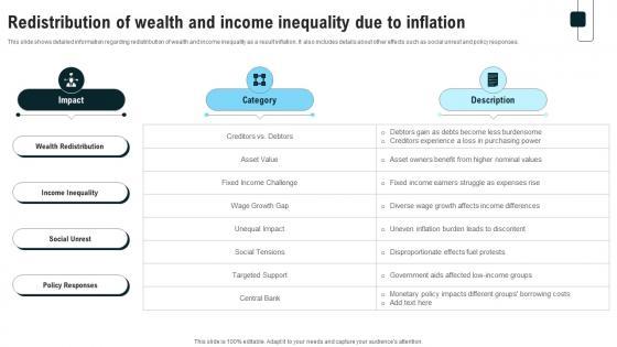 This slide shows detailed information regarding redistribution of wealth and income inequality as a result inflation. It also includes details about other effects such as social unrest and policy responses. Do you have to make sure that everyone on your team knows about any specific topic I yes, then you should give Redistribution Of Wealth And Income Inequality Strategies For Inflation A Tactical Guide Fin SS V a try. Our experts have put a lot of knowledge and effort into creating this impeccable Redistribution Of Wealth And Income Inequality Strategies For Inflation A Tactical Guide Fin SS V. You can use this template for your upcoming presentations, as the slides are perfect to represent even the tiniest detail. You can download these templates from the Slidegeeks website and these are easy to edit. So grab these today This slide shows detailed information regarding redistribution of wealth and income inequality as a result inflation. It also includes details about other effects such as social unrest and policy responses.