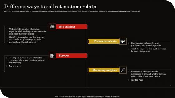This slide shows the different ways to collect customer data which covers web tracking, transactional data, surveys and marketing analytics to understand customer behavior, activities, etc. Crafting an eye catching presentation has never been more straightforward. Let your presentation shine with this tasteful yet straightforward Different Ways To Collect Customer Data Client Retention Strategy To Reduce Churn Rate Portrait Pdf template. It offers a minimalistic and classy look that is great for making a statement. The colors have been employed intelligently to add a bit of playfulness while still remaining professional. Construct the ideal Different Ways To Collect Customer Data Client Retention Strategy To Reduce Churn Rate Portrait Pdf that effortlessly grabs the attention of your audience Begin now and be certain to wow your customers This slide shows the different ways to collect customer data which covers web tracking, transactional data, surveys and marketing analytics to understand customer behavior, activities, etc.