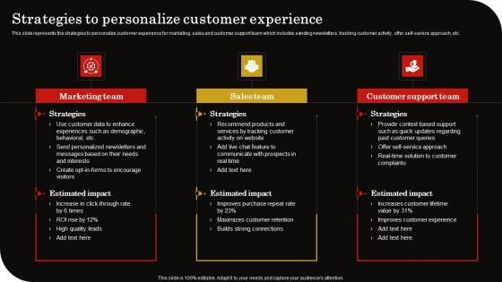 This slide represents the strategies to personalize customer experience for marketing, sales and customer support team which includes sending newsletters, tracking customer activity, offer self service approach, etc. Retrieve professionally designed Strategies Personalize Customer Client Retention Strategy To Reduce Churn Rate Graphics Pdf to effectively convey your message and captivate your listeners. Save time by selecting pre made slideshows that are appropriate for various topics, from business to educational purposes. These themes come in many different styles, from creative to corporate, and all of them are easily adjustable and can be edited quickly. Access them as PowerPoint templates or as Google Slides themes. You do not have to go on a hunt for the perfect presentation because Slidegeeks got you covered from everywhere. This slide represents the strategies to personalize customer experience for marketing, sales and customer support team which includes sending newsletters, tracking customer activity, offer self service approach, etc.