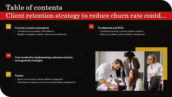 Slidegeeks has constructed Table Of Contents Client Retention Strategy To Reduce Churn Rate Portrait Pdf after conducting extensive research and examination. These presentation templates are constantly being generated and modified based on user preferences and critiques from editors. Here, you will find the most attractive templates for a range of purposes while taking into account ratings and remarks from users regarding the content. This is an excellent jumping off point to explore our content and will give new users an insight into our top notch PowerPoint Templates. Our Table Of Contents Client Retention Strategy To Reduce Churn Rate Portrait Pdf are topically designed to provide an attractive backdrop to any subject. Use them to look like a presentation pro.