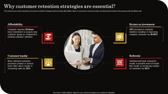 This slide focuses on the importance of customer retention strategies which includes affordability, return on investment, customer loyalty and referrals that results in decreasing customer attrition rate. Presenting this PowerPoint presentation, titled Why Customer Retention Strategies Client Retention Strategy To Reduce Churn Rate Elements Pdf, with topics curated by our researchers after extensive research. This editable presentation is available for immediate download and provides attractive features when used. Download now and captivate your audience. Presenting this Why Customer Retention Strategies Client Retention Strategy To Reduce Churn Rate Elements Pdf. Our researchers have carefully researched and created these slides with all aspects taken into consideration. This is a completely customizable Why Customer Retention Strategies Client Retention Strategy To Reduce Churn Rate Elements Pdf that is available for immediate downloading. Download now and make an impact on your audience. Highlight the attractive features available with our PPTs. This slide focuses on the importance of customer retention strategies which includes affordability, return on investment, customer loyalty and referrals that results in decreasing customer attrition rate.