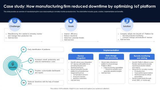 This slide provides an overview of manufacturing firm case study wanting to remotely monitor production line. The slide further includes goals, solution, implementation and benefits. Find highly impressive Optimization Of IoT Remote Monitoring Case Study How Manufacturing Firm Reduced Downtime IoT SS V on Slidegeeks to deliver a meaningful presentation. You can save an ample amount of time using these presentation templates. No need to worry to prepare everything from scratch because Slidegeeks experts have already done a huge research and work for you. You need to download Optimization Of IoT Remote Monitoring Case Study How Manufacturing Firm Reduced Downtime IoT SS V for your upcoming presentation. All the presentation templates are 100 percent editable and you can change the color and personalize the content accordingly. Download now This slide provides an overview of manufacturing firm case study wanting to remotely monitor production line. The slide further includes goals, solution, implementation and benefits.