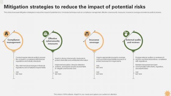 This slide showcases Mitigation strategies to reduce the impact of potential risks. It includes technique such as compliance management, effective cybersecurity measures, insurance coverage and external audits and reviews. Are you searching for a Mitigation Strategies To Reduce The Impact Of Potential Risks Penetrating Markets With Financial Strategy SS V that is uncluttered, straightforward, and original Its easy to edit, and you can change the colors to suit your personal or business branding. For a presentation that expresses how much effort you have put in, this template is ideal With all of its features, including tables, diagrams, statistics, and lists, its perfect for a business plan presentation. Make your ideas more appealing with these professional slides. Download Mitigation Strategies To Reduce The Impact Of Potential Risks Penetrating Markets With Financial Strategy SS V from Slidegeeks today. This slide showcases Mitigation strategies to reduce the impact of potential risks. It includes technique such as compliance management, effective cybersecurity measures, insurance coverage and external audits and reviews.