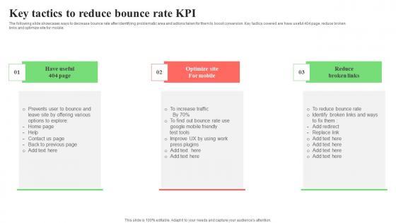 The following slide showcases ways to decrease bounce rate after identifying problematic area and actions taken for them to boost conversion. Key tactics covered are have useful 404 page, reduce broken links and optimize site for mobile. Pitch your topic with ease and precision using this Key Tactics To Reduce Bounce Rate KPI Summary Pdf. This layout presents information on Reduce Broken, Optimize Site, Mobile. It is also available for immediate download and adjustment. So, changes can be made in the color, design, graphics or any other component to create a unique layout. The following slide showcases ways to decrease bounce rate after identifying problematic area and actions taken for them to boost conversion. Key tactics covered are have useful 404 page, reduce broken links and optimize site for mobile.