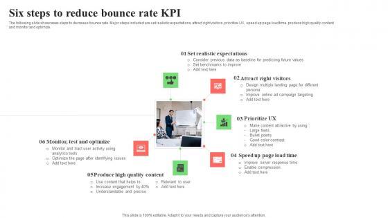 The following slide showcases steps to decrease bounce rate. Major steps included are set realistic expectations, attract right visitors, prioritize UX, speed up page load time, produce high quality content and monitor and optimize. Pitch your topic with ease and precision using this Six Steps To Reduce Bounce Rate KPI Mockup Pdf. This layout presents information on Load Time, Produce High, Quality Content. It is also available for immediate download and adjustment. So, changes can be made in the color, design, graphics or any other component to create a unique layout. The following slide showcases steps to decrease bounce rate. Major steps included are set realistic expectations, attract right visitors, prioritize UX, speed up page load time, produce high quality content and monitor and optimize.