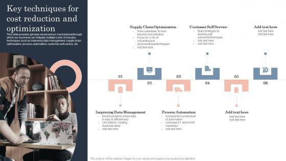 This slide provides glimpse about various mechanisms through which our business can mitigate multiple costs. It includes techniques such as improving data management, supply chain optimization, process automation, customer self service, etc. Slidegeeks is one of the best resources for PowerPoint templates. You can download easily and regulate Adjusting Financial Strategies And Planning Key Techniques For Cost Reduction And Optimization Topics PDF for your personal presentations from our wonderful collection. A few clicks is all it takes to discover and get the most relevant and appropriate templates. Use our Templates to add a unique zing and appeal to your presentation and meetings. All the slides are easy to edit and you can use them even for advertisement purposes.