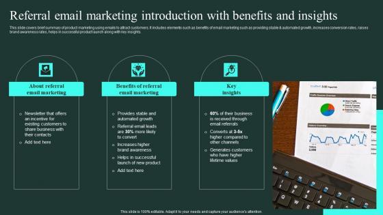 This slide covers brief summary of product marketing using emails to attract customers. It includes elements such as benefits of email marketing such as providing stable and automated growth, increases conversion rates, raises brand awareness rates, helps in successful product launch along with key insights. The Referral Email Marketing Introduction With Benefits And Insights Ppt PowerPoint Presentation Diagram Images PDF is a compilation of the most recent design trends as a series of slides. It is suitable for any subject or industry presentation, containing attractive visuals and photo spots for businesses to clearly express their messages. This template contains a variety of slides for the user to input data, such as structures to contrast two elements, bullet points, and slides for written information. Slidegeeks is prepared to create an impression.