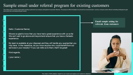 This slide covers sample email sent to existing customers by company asking them to provide referrals. The purpose of this template is to present an email structure used by company under referral marketing strategies to gain new customers and expand target market.Find a pre-designed and impeccable Sample Email Under Referral Program For Existing Customers Word Of Mouth Marketing Pictures Pdf. The templates can ace your presentation without additional effort. You can download these easy-to-edit presentation templates to make your presentation stand out from others. So, what are you waiting for Download the template from Slidegeeks today and give a unique touch to your presentation. This slide covers sample email sent to existing customers by company asking them to provide referrals. The purpose of this template is to present an email structure used by company under referral marketing strategies to gain new customers and expand target market.
