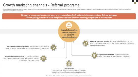 This slide showcases the impact of using referral programs as growth marketing channels to achieve business goals. It provides implementation impact such as increases customer acquisition, increase customer loyalty, cost effectiveness, high conversion, etc. Presenting this PowerPoint presentation, titled Growth Marketing Channels Referral Programs Best Practices For Using MKT SS V, with topics curated by our researchers after extensive research. This editable presentation is available for immediate download and provides attractive features when used. Download now and captivate your audience. Presenting this Growth Marketing Channels Referral Programs Best Practices For Using MKT SS V. Our researchers have carefully researched and created these slides with all aspects taken into consideration. This is a completely customizable Growth Marketing Channels Referral Programs Best Practices For Using MKT SS V that is available for immediate downloading. Download now and make an impact on your audience. Highlight the attractive features available with our PPTs. This slide showcases the impact of using referral programs as growth marketing channels to achieve business goals. It provides implementation impact such as increases customer acquisition, increase customer loyalty, cost effectiveness, high conversion, etc.