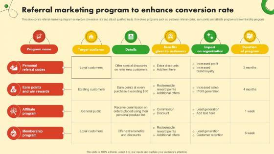 This slide covers referral marketing program to improve conversion rate and attract qualified leads. It involves programs such as, personal referral codes, earn points and affiliate program and membership program. Slidegeeks is one of the best resources for PowerPoint templates. You can download easily and regulate Implementing Strategies To Enhance Referral Marketing Program To Enhance Conversion Rate for your personal presentations from our wonderful collection. A few clicks is all it takes to discover and get the most relevant and appropriate templates. Use our Templates to add a unique zing and appeal to your presentation and meetings. All the slides are easy to edit and you can use them even for advertisement purposes. This slide covers referral marketing program to improve conversion rate and attract qualified leads. It involves programs such as, personal referral codes, earn points and affiliate program and membership program.