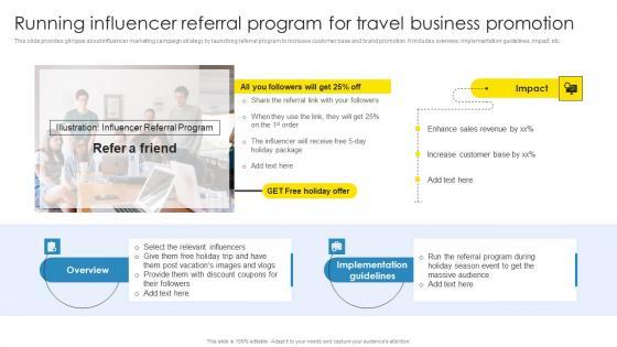 This slide provides glimpse about influencer marketing campaign strategy by launching referral program to increase customer base and brand promotion. It includes overview, implementation guidelines, impact, etc. Find highly impressive Tour And Travel Agency Marketing Running Influencer Referral Program For Travel Portrait PDF on Slidegeeks to deliver a meaningful presentation. You can save an ample amount of time using these presentation templates. No need to worry to prepare everything from scratch because Slidegeeks experts have already done a huge research and work for you. You need to download Tour And Travel Agency Marketing Running Influencer Referral Program For Travel Portrait PDF for your upcoming presentation. All the presentation templates are 100 percent editable and you can change the color and personalize the content accordingly. Download now.