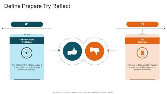 Presenting our innovatively designed set of slides titled Define Prepare Try Reflect In Powerpoint And Google Slides Cpb. This completely editable PowerPoint graphic exhibits Define Prepare Try Reflect that will help you convey the message impactfully. It can be accessed with Google Slides and is available in both standard screen and widescreen aspect ratios. Apart from this, you can download this well structured PowerPoint template design in different formats like PDF, JPG, and PNG. So, click the download button now to gain full access to this PPT design. Our Define Prepare Try Reflect In Powerpoint And Google Slides Cpb are topically designed to provide an attractive backdrop to any subject. Use them to look like a presentation pro.
