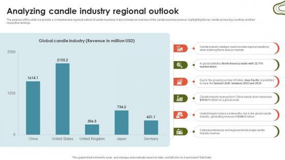 The purpose of this slide is to provide a comprehensive regional outlook of candle business. It also includes an overview of the candle business revenue, highlighting the key candle-producing countries and their respective rankings. Create an editable Candle Business Venture Analyzing Candle Industry Regional Outlook BP SS V that communicates your idea and engages your audience. Whether you are presenting a business or an educational presentation, pre-designed presentation templates help save time. Candle Business Venture Analyzing Candle Industry Regional Outlook BP SS V is highly customizable and very easy to edit, covering many different styles from creative to business presentations. Slidegeeks has creative team members who have crafted amazing templates. So, go and get them without any delay. The purpose of this slide is to provide a comprehensive regional outlook of candle business. It also includes an overview of the candle business revenue, highlighting the key candle-producing countries and their respective rankings.