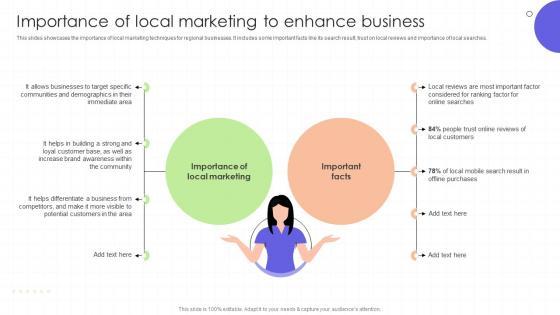 This slides showcases the importance of local marketing techniques for regional businesses. It includes some important facts like its search result, trust on local reviews and importance of local searches.Slidegeeks is here to make your presentations a breeze with Importance Of Local Marketing To Enhance Business Regional Marketing Plan To Boost Sales MKT SS With our easy-to-use and customizable templates, you can focus on delivering your ideas rather than worrying about formatting. With a variety of designs to choose from, you are sure to find one that suits your needs. And with animations and unique photos, illustrations, and fonts, you can make your presentation pop. So whether you are giving a sales pitch or presenting to the board, make sure to check out Slidegeeks first This slides showcases the importance of local marketing techniques for regional businesses. It includes some important facts like its search result, trust on local reviews and importance of local searches.