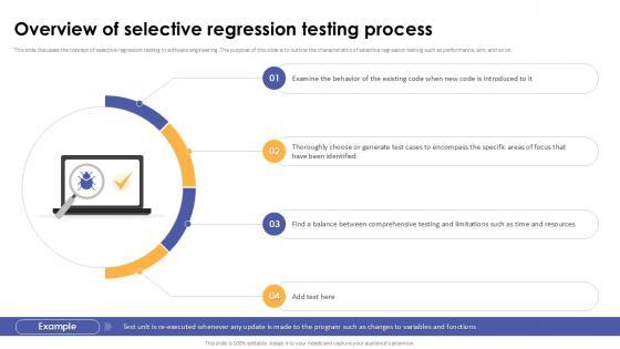 This slide discusses the concept of selective regression testing in software engineering. The purpose of this slide is to outline the characteristics of selective regression testing such as performance, aim, and so on. There are so many reasons you need a Overview Of Selective Regression Testing Process Corrective Regression Testing Ppt Powerpoint The first reason is you can not spend time making everything from scratch, Thus, Slidegeeks has made presentation templates for you too. You can easily download these templates from our website easily. This slide discusses the concept of selective regression testing in software engineering. The purpose of this slide is to outline the characteristics of selective regression testing such as performance, aim, and so on.