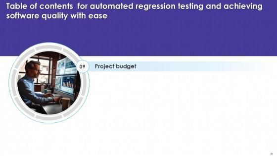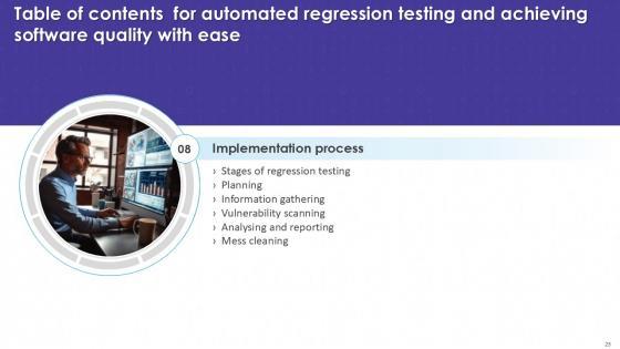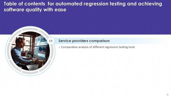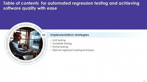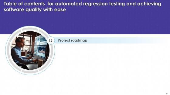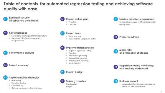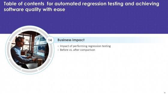 Retrieve professionally designed Table Of Contents Automated Regression Testing And Achieving Software Quality With Ease PPT Example to effectively convey your message and captivate your listeners. Save time by selecting pre-made slideshows that are appropriate for various topics, from business to educational purposes. These themes come in many different styles, from creative to corporate, and all of them are easily adjustable and can be edited quickly. Access them as PowerPoint templates or as Google Slides themes. You do not have to go on a hunt for the perfect presentation because Slidegeeks got you covered from everywhere. Our Table Of Contents Automated Regression Testing And Achieving Software Quality With Ease PPT Example are topically designed to provide an attractive backdrop to any subject. Use them to look like a presentation pro.
