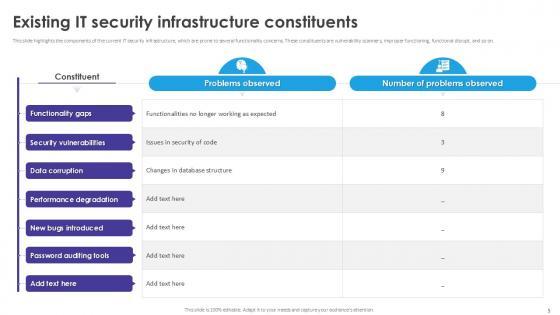 This slide highlights the components of the current IT security infrastructure, which are prone to several functionality concerns. These constituents are vulnerability scanners, improper functioning, functional disrupt, and so on. Get a simple yet stunning designed Existing It Security Infrastructure Automated Regression Testing And Achieving PPT Presentation It is the best one to establish the tone in your meetings. It is an excellent way to make your presentations highly effective. So, download this PPT today from Slidegeeks and see the positive impacts. Our easy-to-edit Existing It Security Infrastructure Automated Regression Testing And Achieving PPT Presentation can be your go-to option for all upcoming conferences and meetings. So, what are you waiting for Grab this template today. This slide highlights the components of the current IT security infrastructure, which are prone to several functionality concerns. These constituents are vulnerability scanners, improper functioning, functional disrupt, and so on.