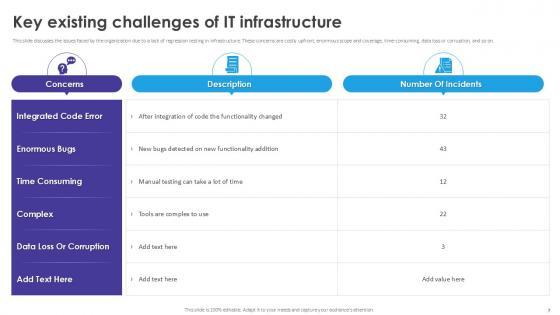 This slide discusses the issues faced by the organization due to a lack of regression testing in infrastructure. These concerns are costly upfront, enormous scope and coverage, time-consuming, data loss or corruption, and so on. Slidegeeks is here to make your presentations a breeze with Key Existing Challenges Of It Automated Regression Testing And Achieving PPT Example With our easy-to-use and customizable templates, you can focus on delivering your ideas rather than worrying about formatting. With a variety of designs to choose from, you are sure to find one that suits your needs. And with animations and unique photos, illustrations, and fonts, you can make your presentation pop. So whether you are giving a sales pitch or presenting to the board, make sure to check out Slidegeeks first This slide discusses the issues faced by the organization due to a lack of regression testing in infrastructure. These concerns are costly upfront, enormous scope and coverage, time-consuming, data loss or corruption, and so on.