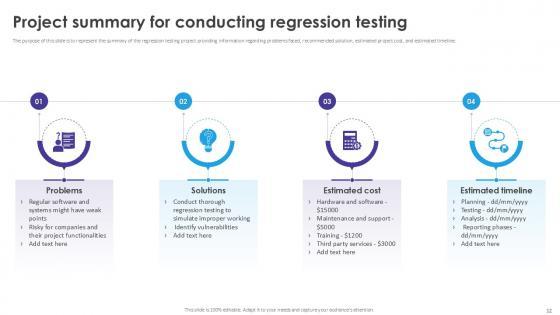 The purpose of this slide is to represent the summary of the regression testing project providing information regarding problems faced, recommended solution, estimated project cost, and estimated timeline. Are you in need of a template that can accommodate all of your creative concepts This one is crafted professionally and can be altered to fit any style. Use it with Google Slides or PowerPoint. Include striking photographs, symbols, depictions, and other visuals. Fill, move around, or remove text boxes as desired. Test out color palettes and font mixtures. Edit and save your work, or work with colleagues. Download Project Summary For Conducting Automated Regression Testing And Achieving PPT PowerPoint and observe how to make your presentation outstanding. Give an impeccable presentation to your group and make your presentation unforgettable. The purpose of this slide is to represent the summary of the regression testing project providing information regarding problems faced, recommended solution, estimated project cost, and estimated timeline.