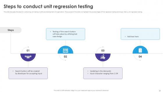 This slide discusses the steps for conducting unit testing in software development of organization. The purpose of this slide is to highlight the process stages of first regression testing technique, that is, unit regression testing. The Steps To Conduct Unit Regression Automated Regression Testing And Achieving PPT Example is a compilation of the most recent design trends as a series of slides. It is suitable for any subject or industry presentation, containing attractive visuals and photo spots for businesses to clearly express their messages. This template contains a variety of slides for the user to input data, such as structures to contrast two elements, bullet points, and slides for written information. Slidegeeks is prepared to create an impression. This slide discusses the steps for conducting unit testing in software development of organization. The purpose of this slide is to highlight the process stages of first regression testing technique, that is, unit regression testing.