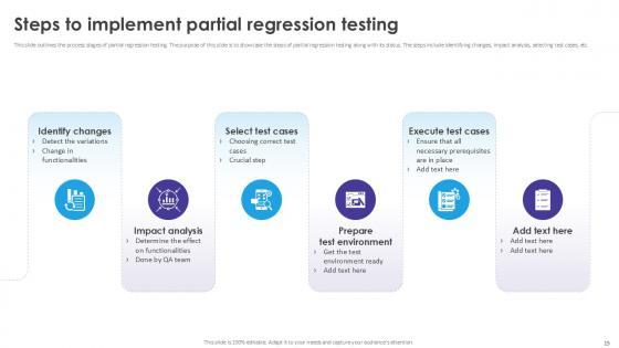 This slide outlines the process stages of partial regression testing. The purpose of this slide is to showcase the steps of partial regression testing along with its status. The steps include identifying changes, impact analysis, selecting test cases, etc. Are you searching for a Steps To Implement Partial Automated Regression Testing And Achieving PPT Slide that is uncluttered, straightforward, and original Its easy to edit, and you can change the colors to suit your personal or business branding. For a presentation that expresses how much effort you have put in, this template is ideal With all of its features, including tables, diagrams, statistics, and lists, its perfect for a business plan presentation. Make your ideas more appealing with these professional slides. Download Steps To Implement Partial Automated Regression Testing And Achieving PPT Slide from Slidegeeks today. This slide outlines the process stages of partial regression testing. The purpose of this slide is to showcase the steps of partial regression testing along with its status. The steps include identifying changes, impact analysis, selecting test cases, etc.