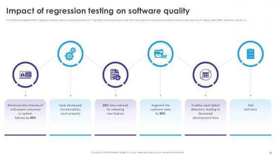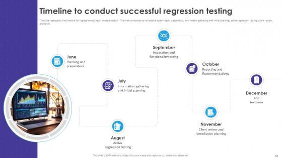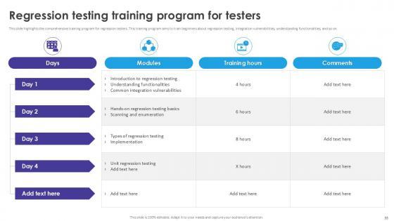 This slide highlights the comprehensive training program for regression testers. This training program aims to train beginners about regression testing, integration vulnerabilities, understanding functionalities, and so on. This modern and well-arranged Regression Testing Training Automated Regression Testing And Achieving PPT Slide provides lots of creative possibilities. It is very simple to customize and edit with the Powerpoint Software. Just drag and drop your pictures into the shapes. All facets of this template can be edited with Powerpoint, no extra software is necessary. Add your own material, put your images in the places assigned for them, adjust the colors, and then you can show your slides to the world, with an animated slide included. This slide highlights the comprehensive training program for regression testers. This training program aims to train beginners about regression testing, integration vulnerabilities, understanding functionalities, and so on.