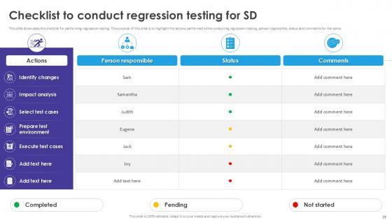 This slide showcases the checklist for performing regression testing. The purpose of this slide is to highlight the actions performed while conducting regression testing, person responsible, status and comments for the same. There are so many reasons you need a Checklist To Conduct Regression Automated Regression Testing And Achieving PPT Slide The first reason is you can not spend time making everything from scratch, Thus, Slidegeeks has made presentation templates for you too. You can easily download these templates from our website easily. This slide showcases the checklist for performing regression testing. The purpose of this slide is to highlight the actions performed while conducting regression testing, person responsible, status and comments for the same.