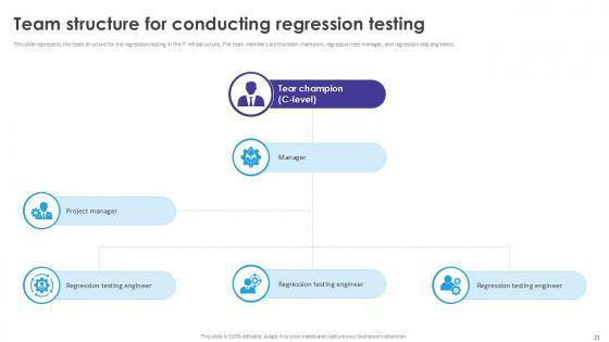 This slide represents the team structure for the regression testing in the IT infrastructure. The team members are the team champion, regression test manager, and regression test engineers. Presenting this PowerPoint presentation, titled Team Structure For Conducting Automated Regression Testing And Achieving PPT Example with topics curated by our researchers after extensive research. This editable presentation is available for immediate download and provides attractive features when used. Download now and captivate your audience. Presenting this Team Structure For Conducting Automated Regression Testing And Achieving PPT Example Our researchers have carefully researched and created these slides with all aspects taken into consideration. This is a completely customizable Team Structure For Conducting Automated Regression Testing And Achieving PPT Example that is available for immediate downloading. Download now and make an impact on your audience. Highlight the attractive features available with our PPTs. This slide represents the team structure for the regression testing in the IT infrastructure. The team members are the team champion, regression test manager, and regression test engineers.