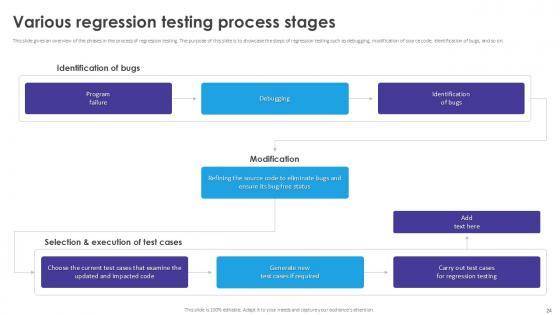 This slide gives an overview of the phases in the process of regression testing. The purpose of this slide is to showcase the steps of regression testing such as debugging, modification of source code, identification of bugs, and so on. Take your projects to the next level with our ultimate collection of Various Regression Testing Automated Regression Testing And Achieving PPT Example Slidegeeks has designed a range of layouts that are perfect for representing task or activity duration, keeping track of all your deadlines at a glance. Tailor these designs to your exact needs and give them a truly corporate look with your own brand colors they will make your projects stand out from the rest This slide gives an overview of the phases in the process of regression testing. The purpose of this slide is to showcase the steps of regression testing such as debugging, modification of source code, identification of bugs, and so on.