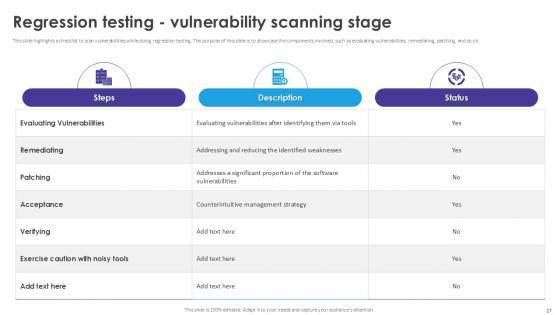 This slide highlights a checklist to scan vulnerabilities while doing regression testing. The purpose of this slide is to showcase the components involved, such as evaluating vulnerabilities, remediating, patching, and so on. This Regression Testing Vulnerability Automated Regression Testing And Achieving PPT Template is perfect for any presentation, be it in front of clients or colleagues. It is a versatile and stylish solution for organizing your meetings. The Regression Testing Vulnerability Automated Regression Testing And Achieving PPT Template features a modern design for your presentation meetings. The adjustable and customizable slides provide unlimited possibilities for acing up your presentation. Slidegeeks has done all the homework before launching the product for you. So, do not wait, grab the presentation templates today This slide highlights a checklist to scan vulnerabilities while doing regression testing. The purpose of this slide is to showcase the components involved, such as evaluating vulnerabilities, remediating, patching, and so on.