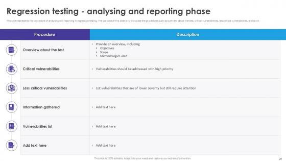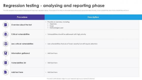 This slide represents the procedure of analysing and reporting in regression testing. The purpose of this slide is to showcase the procedures such as overview about the test, critical vulnerabilities, less critical vulnerabilities, and so on. Make sure to capture your audiences attention in your business displays with our gratis customizable Regression Testing Analysing And Automated Regression Testing And Achieving PPT Presentation These are great for business strategies, office conferences, capital raising or task suggestions. If you desire to acquire more customers for your tech business and ensure they stay satisfied, create your own sales presentation with these plain slides. This slide represents the procedure of analysing and reporting in regression testing. The purpose of this slide is to showcase the procedures such as overview about the test, critical vulnerabilities, less critical vulnerabilities, and so on.