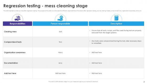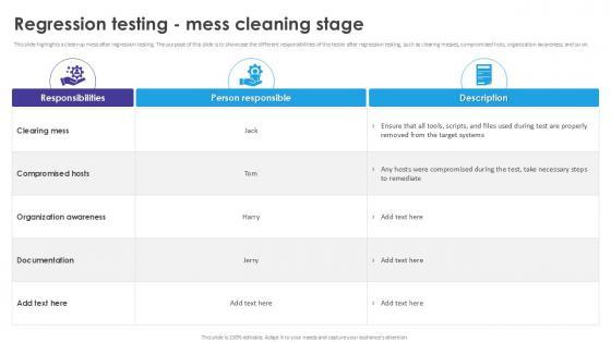 This slide highlights a clean-up mess after regression testing. The purpose of this slide is to showcase the different responsibilities of the tester after regression testing, such as clearing messes, compromised hots, organization awareness, and so on. Coming up with a presentation necessitates that the majority of the effort goes into the content and the message you intend to convey. The visuals of a PowerPoint presentation can only be effective if it supplements and supports the story that is being told. Keeping this in mind our experts created Regression Testing Mess Cleaning Automated Regression Testing And Achieving PPT Template to reduce the time that goes into designing the presentation. This way, you can concentrate on the message while our designers take care of providing you with the right template for the situation. This slide highlights a clean-up mess after regression testing. The purpose of this slide is to showcase the different responsibilities of the tester after regression testing, such as clearing messes, compromised hots, organization awareness, and so on.