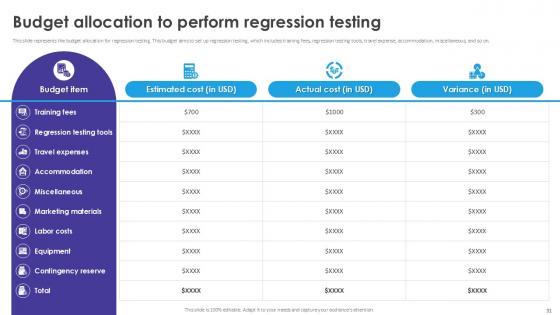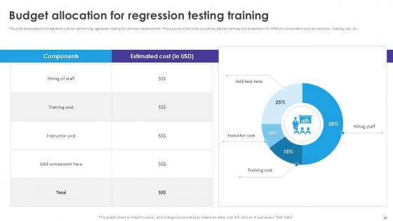 This slide showcases the breakdown cost for performing regression testing for software development. The purpose of this slide is to showcase the training cost breakdown for different components such as instructor, training cost, etc. Slidegeeks is one of the best resources for PowerPoint templates. You can download easily and regulate Budget Allocation For Regression Automated Regression Testing And Achieving PPT Template for your personal presentations from our wonderful collection. A few clicks is all it takes to discover and get the most relevant and appropriate templates. Use our Templates to add a unique zing and appeal to your presentation and meetings. All the slides are easy to edit and you can use them even for advertisement purposes. This slide showcases the breakdown cost for performing regression testing for software development. The purpose of this slide is to showcase the training cost breakdown for different components such as instructor, training cost, etc.