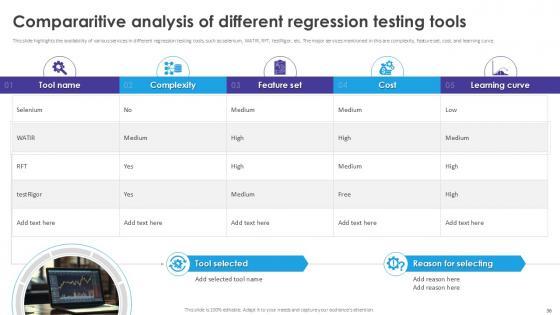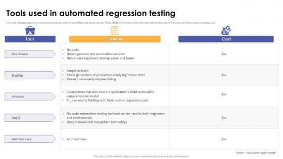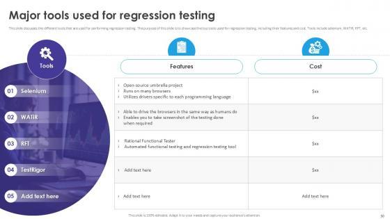 This slide discusses the different tools that are used for performing regression testing. The purpose of this slide is to showcase the top tools used for regression testing, including their features and cost. Tools include selenium, WATIR, RFT, etc. Whether you have daily or monthly meetings, a brilliant presentation is necessary. Major Tools Used For Regression Automated Regression Testing And Achieving PPT Slide can be your best option for delivering a presentation. Represent everything in detail using Major Tools Used For Regression Automated Regression Testing And Achieving PPT Slide and make yourself stand out in meetings. The template is versatile and follows a structure that will cater to your requirements. All the templates prepared by Slidegeeks are easy to download and edit. Our research experts have taken care of the corporate themes as well. So, give it a try and see the results. This slide discusses the different tools that are used for performing regression testing. The purpose of this slide is to showcase the top tools used for regression testing, including their features and cost. Tools include selenium, WATIR, RFT, etc.