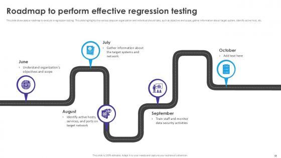 This slide showcases a roadmap to execute a regression testing. This slide highlights the various steps an organization and individual should take, such as objective and scope, gather information about target system, identify active host, etc. Welcome to our selection of the Roadmap To Perform Effective Automated Regression Testing And Achieving PPT PowerPoint These are designed to help you showcase your creativity and bring your sphere to life. Planning and Innovation are essential for any business that is just starting out. This collection contains the designs that you need for your everyday presentations. All of our PowerPoints are 100Percent editable, so you can customize them to suit your needs. This multi-purpose template can be used in various situations. Grab these presentation templates today. This slide showcases a roadmap to execute a regression testing. This slide highlights the various steps an organization and individual should take, such as objective and scope, gather information about target system, identify active host, etc.