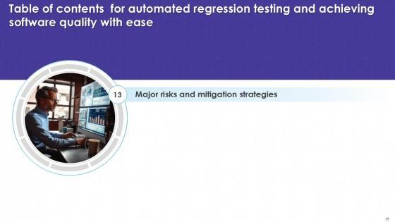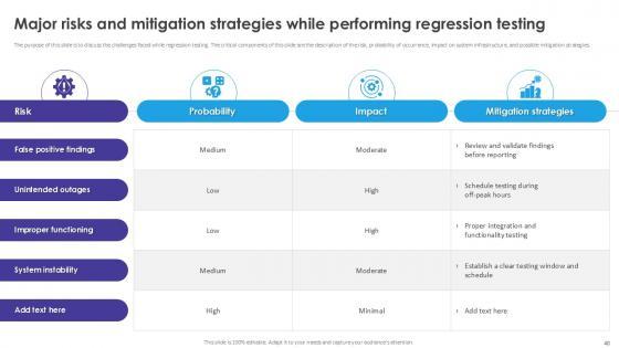 The purpose of this slide is to discuss the challenges faced while regression testing. The critical components of this slide are the description of the risk, probability of occurrence, impact on system infrastructure, and possible mitigation strategies. Do you have an important presentation coming up Are you looking for something that will make your presentation stand out from the rest Look no further than Major Risks And Mitigation Automated Regression Testing And Achieving PPT Example With our professional designs, you can trust that your presentation will pop and make delivering it a smooth process. And with Slidegeeks, you can trust that your presentation will be unique and memorable. So why wait Grab Major Risks And Mitigation Automated Regression Testing And Achieving PPT Example today and make your presentation stand out from the rest The purpose of this slide is to discuss the challenges faced while regression testing. The critical components of this slide are the description of the risk, probability of occurrence, impact on system infrastructure, and possible mitigation strategies.