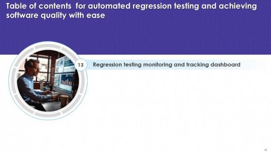 Slidegeeks has constructed Table Of Contents For Automated Regression Testing And Achieving Software Quality With Ease PPT Template after conducting extensive research and examination. These presentation templates are constantly being generated and modified based on user preferences and critiques from editors. Here, you will find the most attractive templates for a range of purposes while taking into account ratings and remarks from users regarding the content. This is an excellent jumping-off point to explore our content and will give new users an insight into our top-notch PowerPoint Templates. Our Table Of Contents For Automated Regression Testing And Achieving Software Quality With Ease PPT Template are topically designed to provide an attractive backdrop to any subject. Use them to look like a presentation pro.
