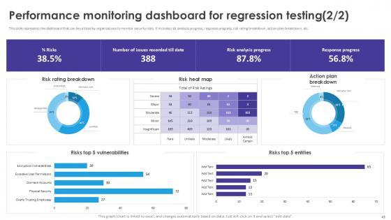 This slide showcases the performance tracking dashboard for regression testing. The purpose of this slide is to highlight the performance of regression testing by including components such as execution test outcomes overall, in progress and so on. If your project calls for a presentation, then Slidegeeks is your go-to partner because we have professionally designed, easy-to-edit templates that are perfect for any presentation. After downloading, you can easily edit Performance Monitoring Dashboard Automated Regression Testing And Achieving PPT Example and make the changes accordingly. You can rearrange slides or fill them with different images. Check out all the handy templates This slide showcases the performance tracking dashboard for regression testing. The purpose of this slide is to highlight the performance of regression testing by including components such as execution test outcomes overall, in progress and so on.