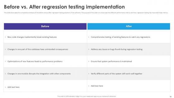 This slide showcases the comparative analysis of the before versus after regression testing situation of the software. The purpose of this slide is to showcase the different performance metrics and how regression testing has improved these metrics. Create an editable Before Vs After Regression Automated Regression Testing And Achieving PPT PowerPoint that communicates your idea and engages your audience. Whether you are presenting a business or an educational presentation, pre-designed presentation templates help save time. Before Vs After Regression Automated Regression Testing And Achieving PPT PowerPoint is highly customizable and very easy to edit, covering many different styles from creative to business presentations. Slidegeeks has creative team members who have crafted amazing templates. So, go and get them without any delay. This slide showcases the comparative analysis of the before versus after regression testing situation of the software. The purpose of this slide is to showcase the different performance metrics and how regression testing has improved these metrics.