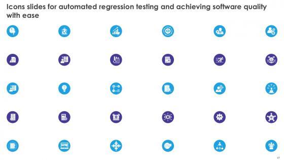 Presenting our innovatively structured Icons Slides For Automated Regression Testing And Achieving Software Quality With Ease PPT Example set of slides. The slides contain a hundred 100 percent editable icons. You can replace these icons without any inconvenience. Therefore, pick this set of slides and create a striking presentation. Our Icons Slides For Automated Regression Testing And Achieving Software Quality With Ease PPT Example are topically designed to provide an attractive backdrop to any subject. Use them to look like a presentation pro.