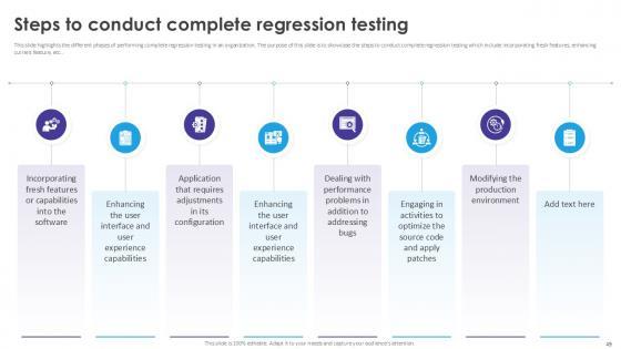 This slide highlights the different phases of performing complete regression testing in an organization. The purpose of this slide is to showcase the steps to conduct complete regression testing which include incorporating fresh features, enhancing current feature, etc.. The best PPT templates are a great way to save time, energy, and resources. Slidegeeks have 100 percent editable powerpoint slides making them incredibly versatile. With these quality presentation templates, you can create a captivating and memorable presentation by combining visually appealing slides and effectively communicating your message. Download Steps To Conduct Complete Automated Regression Testing And Achieving PPT Slide from Slidegeeks and deliver a wonderful presentation. This slide highlights the different phases of performing complete regression testing in an organization. The purpose of this slide is to showcase the steps to conduct complete regression testing which include incorporating fresh features, enhancing current feature, etc..