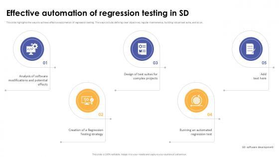 This slide highlights the ways to achieve effective automation of regression testing. The ways include defining clear objectives, regular maintenance, building robust test suite, and so on. This Effective Automation Of Regression Testing In Sd Corrective Regression Testing Ppt Example is perfect for any presentation, be it in front of clients or colleagues. It is a versatile and stylish solution for organizing your meetings. The Effective Automation Of Regression Testing In Sd Corrective Regression Testing Ppt Example features a modern design for your presentation meetings. The adjustable and customizable slides provide unlimited possibilities for acing up your presentation. Slidegeeks has done all the homework before launching the product for you. So, do not wait, grab the presentation templates today This slide highlights the ways to achieve effective automation of regression testing. The ways include defining clear objectives, regular maintenance, building robust test suite, and so on.