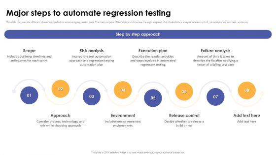 This slide discusses the different phases involved while automating regression tests. The main purpose of this slide is to showcase the eight steps which includes failure analysis, release control, risk analysis, environment, and so on. This Major Steps To Automate Regression Testing Corrective Regression Testing Ppt Template from Slidegeeks makes it easy to present information on your topic with precision. It provides customization options, so you can make changes to the colors, design, graphics, or any other component to create a unique layout. It is also available for immediate download, so you can begin using it right away. Slidegeeks has done good research to ensure that you have everything you need to make your presentation stand out. Make a name out there for a brilliant performance. This slide discusses the different phases involved while automating regression tests. The main purpose of this slide is to showcase the eight steps which includes failure analysis, release control, risk analysis, environment, and so on.