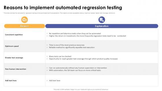 This slide outlines the rationale for regression testing to be automated and its explanation. The reasons include repeatable nature, maximum speed, higher test coverage, and so on. Do you have an important presentation coming up Are you looking for something that will make your presentation stand out from the rest Look no further than Reasons To Implement Automated Regression Testing Corrective Regression Testing Ppt Powerpoint With our professional designs, you can trust that your presentation will pop and make delivering it a smooth process. And with Slidegeeks, you can trust that your presentation will be unique and memorable. So why wait Grab Reasons To Implement Automated Regression Testing Corrective Regression Testing Ppt Powerpoint today and make your presentation stand out from the rest This slide outlines the rationale for regression testing to be automated and its explanation. The reasons include repeatable nature, maximum speed, higher test coverage, and so on.
