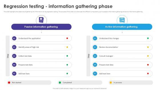 This slide highlights the objectives of gathering the information during regression testing. The purpose of this slide is to showcase the different components, such as passive information gathering and active information gathering. Formulating a presentation can take up a lot of effort and time, so the content and message should always be the primary focus. The visuals of the PowerPoint can enhance the presenters message, so our Regression Testing Information Automated Regression Testing And Achieving PPT Slide was created to help save time. Instead of worrying about the design, the presenter can concentrate on the message while our designers work on creating the ideal templates for whatever situation is needed. Slidegeeks has experts for everything from amazing designs to valuable content, we have put everything into Regression Testing Information Automated Regression Testing And Achieving PPT Slide This slide highlights the objectives of gathering the information during regression testing. The purpose of this slide is to showcase the different components, such as passive information gathering and active information gathering.