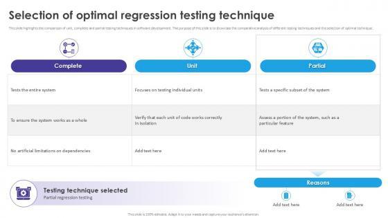 This slide highlights the comparison of unit, complete and partial testing techniques in software development. The purpose of this slide is to showcase the comparative analysis of different testing techniques and the selection of optimal technique . Explore a selection of the finest Selection Of Optimal Regression Automated Regression Testing And Achieving PPT Slide here. With a plethora of professionally designed and pre-made slide templates, you can quickly and easily find the right one for your upcoming presentation. You can use our Selection Of Optimal Regression Automated Regression Testing And Achieving PPT Slide to effectively convey your message to a wider audience. Slidegeeks has done a lot of research before preparing these presentation templates. The content can be personalized and the slides are highly editable. Grab templates today from Slidegeeks. This slide highlights the comparison of unit, complete and partial testing techniques in software development. The purpose of this slide is to showcase the comparative analysis of different testing techniques and the selection of optimal technique .