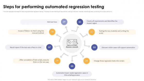 This slide highlights the steps for executing automated regression testing. The steps include checking all requirement, testing all the new modules, identifying cases, converting into scripts, and so on. Welcome to our selection of the Steps For Performing Automated Regression Testing Corrective Regression Testing Ppt Powerpoint These are designed to help you showcase your creativity and bring your sphere to life. Planning and Innovation are essential for any business that is just starting out. This collection contains the designs that you need for your everyday presentations. All of our PowerPoints are 100Percent editable, so you can customize them to suit your needs. This multi-purpose template can be used in various situations. Grab these presentation templates today. This slide highlights the steps for executing automated regression testing. The steps include checking all requirement, testing all the new modules, identifying cases, converting into scripts, and so on.
