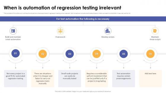The purpose of this slide is to outlines the situations where automation regression testing is not relevant. Such situations include small scale projects, when we need it to be done in less cost, and so on. Find a pre-designed and impeccable When Is Automation Of Regression Testing Irrelevant Corrective Regression Testing Ppt Slide The templates can ace your presentation without additional effort. You can download these easy-to-edit presentation templates to make your presentation stand out from others. So, what are you waiting for Download the template from Slidegeeks today and give a unique touch to your presentation. The purpose of this slide is to outlines the situations where automation regression testing is not relevant. Such situations include small scale projects, when we need it to be done in less cost, and so on.